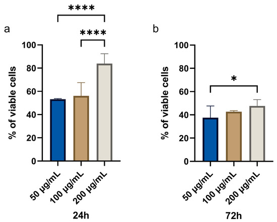 The percentage of viable OSCC cells following treatment with CBN/PVP nanoparticles at concentrations of 50 µg/mL, 100 µg/mL, and 200 µg/mL over two time points: (a) 24 h and (b) 72 h. Each bar represents the mean ± standard error of the mean (SEM) for the percentage of viable cells under the specified conditions. * p < 0.05, **** p < 0.0001.