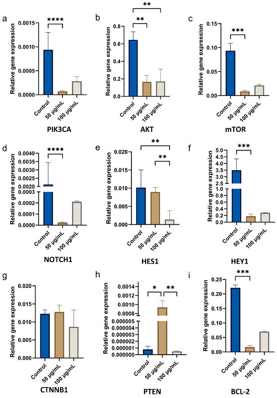 To determine the possible mechanisms of CBN/PVP action, cells were treated for 72 h with the two lower concentrations that had a greater cytotoxic effect, and the relative expressions of the PI3K/AKT/mTOR (PAM), Notch1/Hes1, and Wnt/β-catenin signaling pathways, along with the anti-apoptotic BCL-2, transcription factor HEY1, and tumor suppressor PTEN genes were examined (Figure 9). It appeared that CBN/PVP treatment with the 50 µg/mL concentration significantly suppressed the expression of PIK3CA (p < 0.0001), AKT (p = 0.0005), mTOR (p < 0.0001), NOTCH1 (p < 0.0001), HES1 (p = 0.002), HEY1 (p = 0.0002), and BCL-2 (p < 0.0001), while β-catenin (CTNNB1 gene) expression remained unaffected. This material showed an effect on PTEN, leading to a significant activation of this tumor suppressor (p = 0.0179).