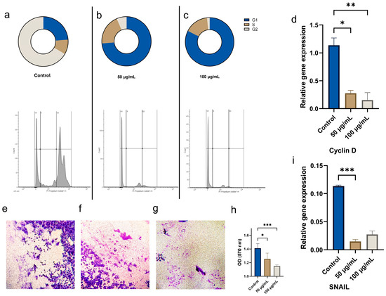 Effect of CBN/PVP on cell-cycle phase distribution, gene expression, and cell invasion. Cell-cycle phase distribution in (a) untreated cells (control), and cells exposed to CBN/PVP at concentrations of (b) 50 µg/mL and (c) 100 µg/mL, (d) the expression of cell-cycle-related gene Cyclin D, (e–g) cell invasion (magnification 10×), (h) the quantification of invasion, and (i) the expression of the related gene SNAIL in comparison to untreated control cells. Data are presented as mean ± SEM * p < 0.05, ** p < 0.01, and *** p < 0.001.