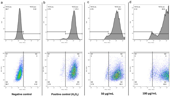To put forward a possible mechanism of CBN/PVP action, the oxidative damage to OSCC cells via increased ROS production was examined. Flow cytometry experiments with DCFH2-DA fluorescein were used to measure cellular ROS formation and investigate whether differences in intracellular ROS levels appeared in OSCC cells treated with CBN/PVP at different concentrations. ROS predominantly include superoxide anions (O2−), and to a lesser extent hydrogen peroxide (H2O2) and hydroxyl radicals (OH). Though less represented, H2O2 is a stable ROS, able to cross the cell membrane through diffusion mechanisms, and it plays a crucial role in ROS-dependent signaling [25]. Figure 11 depicts the production of ROS in OSCC cells that were not treated with CBN/PVP (Figure 11a), in cells treated with H2O2 (Figure 11b), and in cells treated with CBN/PVP at concentrations of 50 µg/mL (Figure 11c) and 100 µg/mL (Figure 11d). Our results indicate that the treatment at both tested concentrations increased ROS production.