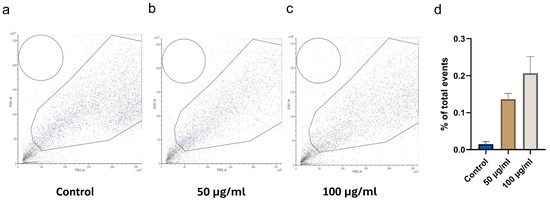The cellular uptake of CBN/PVP nanoparticles after 24 h of treatment is quantified and presented in Figure 12. The data show a dose-dependent increase in uptake, though without statistical significance, while the relatively low uptake percentage suggests that the nanoparticles may primarily adhere to the cell membrane or affect the dynamics of cell–nanoparticle interactions.
