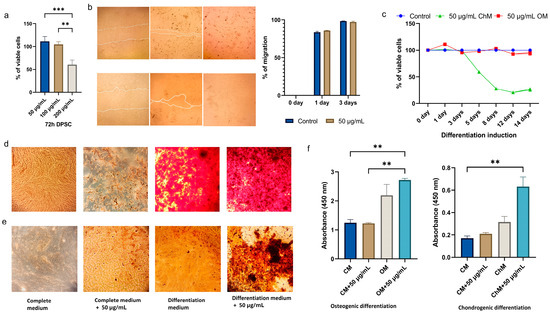 Cell viability and differentiation: (a) the percentage of viable DPSCs after 72 h of exposure to CBN/PVP at concentrations of 50 µg/mL, 100 µg/mL, and 200 µg/mL; (b) microscopy and measuring of cell migration by wound healing assay (magnification 40×); (c) cell viability during differentiation (MTT assay); (d) microscopy of osteogenic induction of DPSCs grown in complete medium only, in complete medium supplemented with 50 µg/mL of nanomaterial, differentiation medium alone, and differentiation medium enriched with 50 µg/mL of CBN/PVP (magnification 40×); (e) chondrogenic induction of DPSCs grown in complete medium only, in complete medium supplemented with 50 µg/mL of nano-material, differentiation medium alone, and differentiation medium enriched with 50 µg/mL of CBN/PVP (magnification 40×); (f) quantification of Alizarin red staining of Ca deposits and quantification of Safranin O staining of lipid droplets. Data are presented as mean ± SEM. ** p < 0.01, *** p < 0.001.