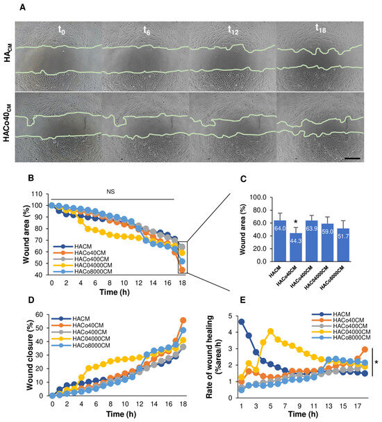 Effects of HACoCM on wound healing of MSCs from t0–t18. Scratch wounds were created in the middle of the well from left to right (x axis). (A) Time-lapse images of wound front. The upper panel is representative images of HACM-treated wound at t0, t6, t12, and t18. The lower panel is representative images of HACo40CM-treated wound at t0, t6, t12, and t18. Light green lines demonstrate the wound margin in each time point. The area between the lines represents the area lacking cells. Scale bar is 200 µm. (B) Quantification of the wound area (%) from t0 to t18. (C) A graph presents the mean values of each wound area at t18. (D) Measurement of wound closure (%) from t0 to t18. (E) The rate of wound healing (%area/h) from t0 to t18. * p < 0.05.