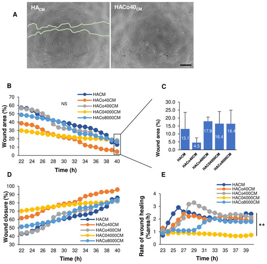 Wound healing of MSCs under HACoCM from t23 to t40. (A) Time-lapse images of wound front at t40 after wounding. The left panel is a representative image of HA-treated wound, while the right panel is a representative image of HACo40CM-treated wound. Scale bar is 200 µm. (B) Quantification of the wound area (%) from t23 to t40. (C) A graph presents the mean values of each wound area at t40. (D) Measurement of wound closure (%) from t23 to t40. (E) The rate of wound healing (%area/h) from t23 to t40. ** p < 0.01.