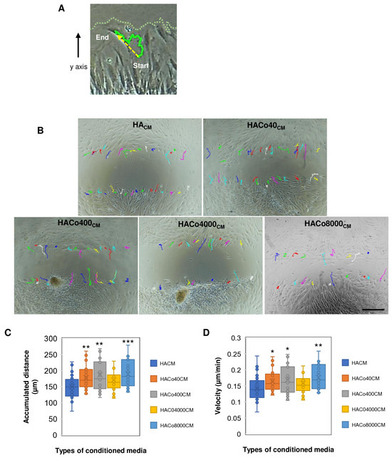 The trajectory of a migrating cell treated with HACM was displayed in a green line (Figure 3A). This line was the actual cell path in the 18 h period. Although the cells migrated toward the scratch area, the cells did not move in a straightforward direction but rather in a random direction (x and y axis) (Figure 3A,B). The entire length of the cell transversed in the 18 h period is shown in Figure 3C. The accumulated distance for HACM was 150 µm. HACo40CM, HACo400CM, and HACo8000CM significantly increased the distance of cell movement. The velocity of control cells was 0.142 µm/min. The mean velocity of cell migration was increased by HACoCM (Figure 3D).