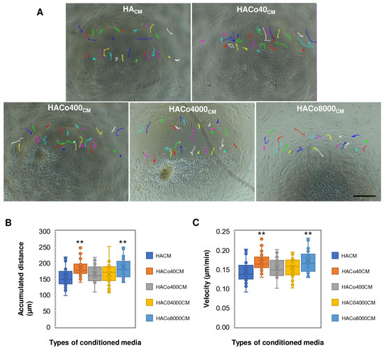 Enhancement of individual cell migration under HACoCM from t23 to t40. (A) Trajectories of representative cells are marked in different colors. The scale bar is 200 µm. (B) The accumulated distance of a cell migrated from the starting point to the end point from t23 to t40. (C) The average speed of a cell. The x mark in each box plot represents the mean value. ** p < 0.01.