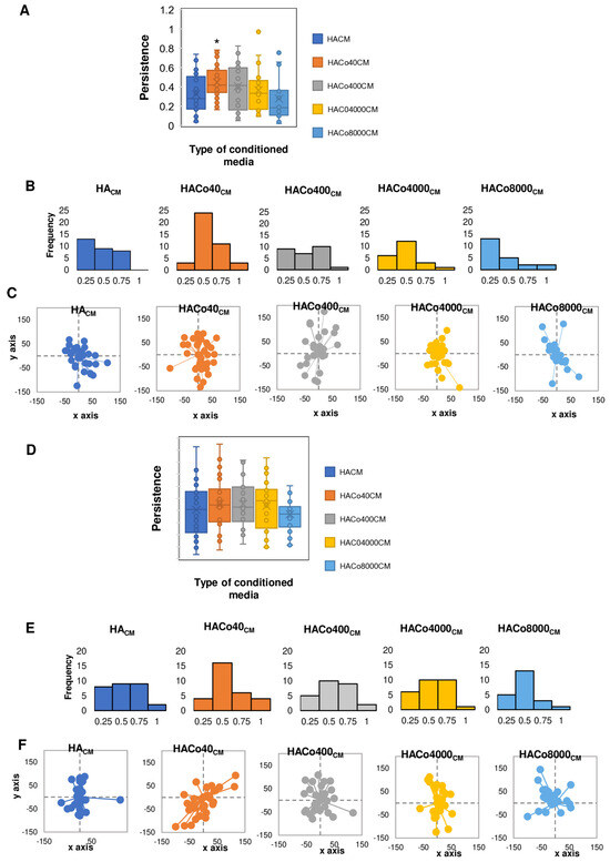 No change in persistence among all groups at t23–t40 was observed (Figure 5D). The distribution pattern of HACo40CM at t23–t40 was similar to that at t0–t18 (Figure 5E). The pattern of HACo40CM-treated cells altered to a more oblique direction since the cells tended to move to free space between cells (Figure 5F).