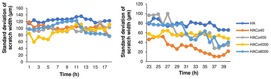 We observed that MSCs responded to HACo40CM by reducing the wound area and increasing the rate of wound healing at t18. This response accelerated the speed of wound closure from more than 40 h to approximately 40 h. For bone injury, an influx of osteoblast lineage population to the injury site is an important event prior to bone repair/regeneration. MSC migration to the bone-repairing surface is crucial for the bone healing process [24]. Faster migration of MSCs would accelerate bone repair. The addition of CoCl2 at 50–100 µM increases the migration of mouse BMSCs and stem cells from human exfoliated deciduous teeth into the scratch wound [14,25]. Therefore, Co addition to HACo40 could be beneficial for the promotion of the early stage of wound healing.