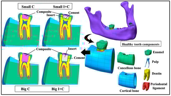 For the purpose of numerical simulation, the geometry of the right mandibular first molar was reconstructed from the Open Mandible Source 3D scan [28] https://github.com/ArsoVukicevic/OpenMandible, accessed on 13 April 2021. The model included the morphological distribution of all dental tissues, so the dental tissues did not need to be subsequently separated, marked, or anything similar. To minimize the influence of boundary conditions on the numerical simulation, the geometry of the mandible in the immediate vicinity was also reconstructed. The 3D geometry of the tooth was generated utilizing non-uniform rational B-spline (NURBS) surfaces within patch boundaries established by polygonized points. The patch network was drawn manually to achieve higher quality surfaces. The deviation of the created surfaces from the mesh was less than 0.1 mm. Tooth height was 21 mm, the Vestibule-Oral dimension was 10 mm, and the mesial-distal dimension was 11 mm. Tooth geometry was further adapted for five scenarios: a healthy tooth and a tooth with two possible cavity depths—small cavity and big cavity—both restored with restorations comprising only composite (codes: Small C and Big C) in control groups. The diameter of the hole (cylinder preparation) was 5.5 mm, with two possible depths. In the experimental groups, the restorations were composed of a combination of insert, resin-based cement, and composite in the following way: HAP inserts with thicknesses of 1.7 or 4.7 mm and diameters of 4.7 mm for the small and big cavities, respectively (codes: Small I+C and Big I+C), cemented by resin-based cement as a bowl beneath and circumferentially around the insert with the thickness 0.5 mm, and covered with a top layer of composite above the insert in the enamel part of the tooth (Figure 1). The dimensions of the used lower first molar are provided in Figure 1.