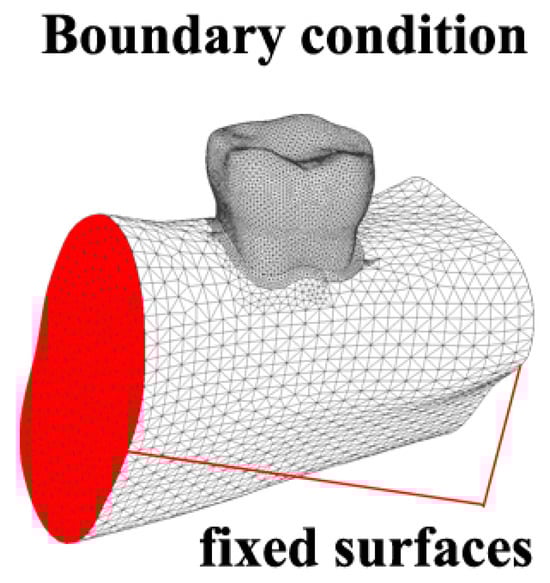 Fixed boundary conditions were placed on the side surfaces of the mandible segment to minimize their influence on the model. The boundary conditions and finite element (FE) mesh are shown in Figure 2.