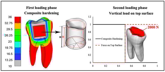 In the second loading phase, an ultimate load of 2000 N was uniformly applied over the entire occlusal surface, in accordance with the maximum force used in previous studies [32,33]. This load greatly exceeds masticatory forces, as the reported maximum bite force for vital and devitalized teeth after pulp removal is 207.93 N and 226.6 N, respectively [35]. While the forces applied are much higher than those encountered during normal chewing, the objective was to conduct a preliminary investigation into the effects of HAP inserts on overall tooth integrity under extreme conditions, in order to assess their maximum potential benefits.