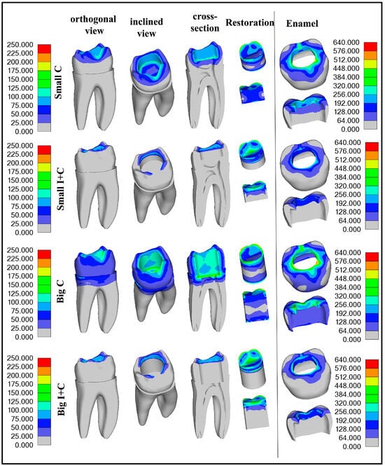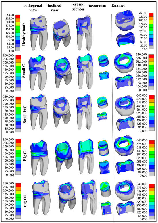 Results of maximum Von Mises stress values caused by simulated polymerization contraction and subsequent load application on the top surface (Figure 3) are presented in Table 4 and Figure 6. Figure 5 graphically illustrates the stress distribution within the models. The legend value bar for the enamel of the healthy tooth differs from the bar of teeth with cavities, as it showed lower values, aligning more closely with those of dentin.