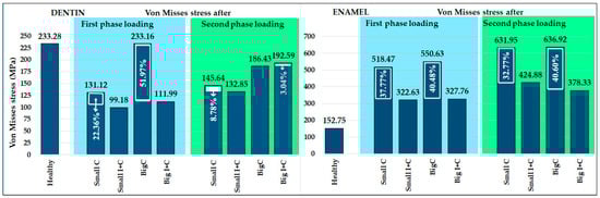 Maximal detected values of von Misses stress in dentin and enamel, for both loading phases with decrease percentages shown.