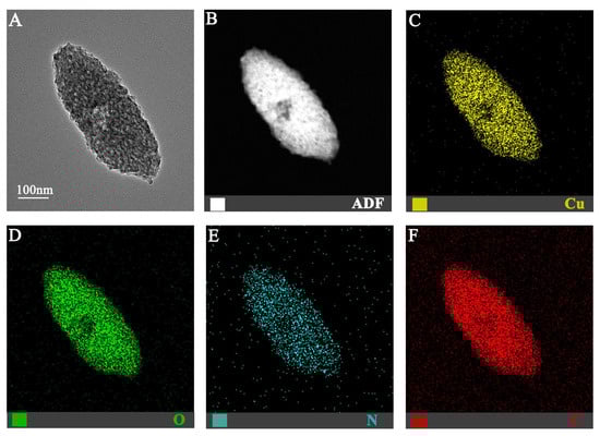 TEM image of Cu-MOF-74 (A) and the corresponding elemental mapping (B–F).