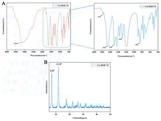 FTIR spectra (A) and XRD pattern (B) of Cu-MOF-74.