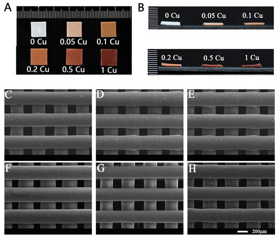 Photographs of the Cu-MOF-74/HAp/PCL composite scaffolds (A,B) and SEM images of the different Cu-MOF-74/HAp/PCL scaffolds: 0 Cu (C), 0.05 Cu (D), 0.1 Cu (E), 0.2 Cu (F), 0.5 Cu (G), and 1 Cu (H).