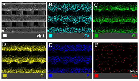 EDS mapping (Figure 4) verified the homogeneous elemental distribution of C (54.76 ± 5.18%), O (36.21 ± 3.50%), Ca (6.15 ± 0.32%), P (2.71 ± 0.12%), and Cu (0.17 ± 0.02%) in the 0.2 Cu composite scaffolds, confirming successful composite integration without phase segregation.