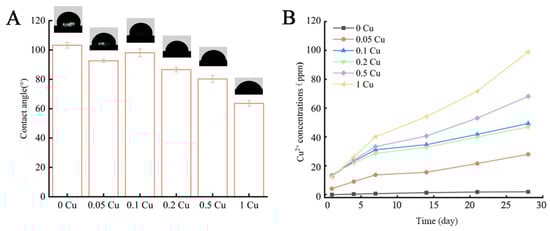 The hydrophilicity of the composite scaffolds showed significant Cu-MOF-74 dose-dependence (p < 0.01). The water contact angles decreased from 103.3 ± 2.02° (0 Cu) to 63.60 ± 1.93° (1 Cu) (Figure 5A), transitioning from hydrophobic to hydrophilic behavior (threshold at 0.2 Cu). This enhancement in hydrophilicity correlates with the increased surface polarity imparted by the coordinatively unsaturated metal sites of Cu-MOF-74.