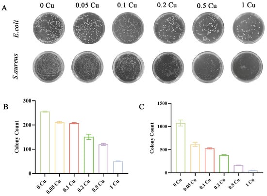 The antimicrobial efficacy of the 3D-printed Cu-MOF-74/PCL/HAp scaffolds was quantitatively assessed against two clinically relevant bacterial strains, S. aureus (Gram-positive) and E. coli (Gram-negative), using the standardized colony-forming unit counting method. As illustrated in Figure 6, a clear concentration-dependent antibacterial relationship was observed.