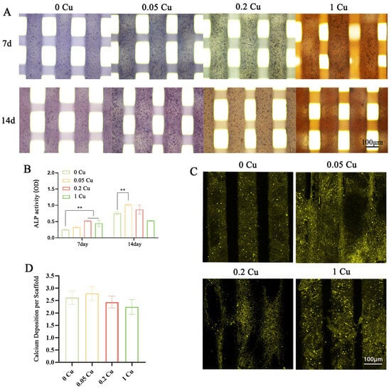 To systematically evaluate the osteogenic potential of the Cu-MOF-74/HAp/PCL composite scaffolds, ALP activity and mineralization capacity were analyzed at multiple timepoints. ALP staining and quantitative analysis revealed distinct temporal and concentration-dependent effects on BMSC differentiation. At day 7, ALP staining showed significantly more intense dark blue coloration in the 0.2 Cu and 1 Cu composite scaffolds compared to the control group (0 Cu), indicating higher ALP activity (Figure 8A). Quantitative analysis further confirmed that the 0.2 Cu and 1 Cu groups exhibited 2.1-fold and 1.8-fold higher ALP activity, respectively, than the control group (p < 0.01). Notably, the 0.2 Cu group demonstrated the highest ALP activity at this timepoint (Figure 8B). By day 14, the 0.05 Cu group showed the most pronounced ALP activity, with a 1.4-fold increase compared to the control (p < 0.01). However, higher copper concentrations (≥0.2 Cu) did not significantly promote ALP activity (p > 0.05).