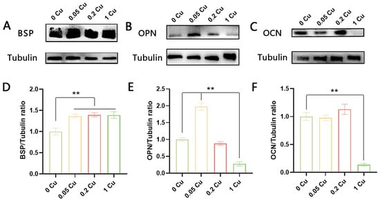 Western blot analysis of osteogenic marker expression (A–D) and quantitative analysis (D–F) at 21 days; (A,D) bone sialoprotein (BSP), (B,E) osteopontin (OPN), (C,F) osteocalcin (OCN); β-tubulin was used to normalize protein input and quantification; ** p < 0.01.