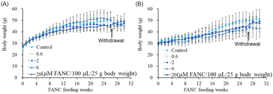 Body weight of ICR mice after daily feeding with FANCs for 6 months, followed by 4-week withdrawal. Body weight of (A) male and (B) female mice. Data are expressed as mean ± SD (n = 8; withdrawal: n = 3).