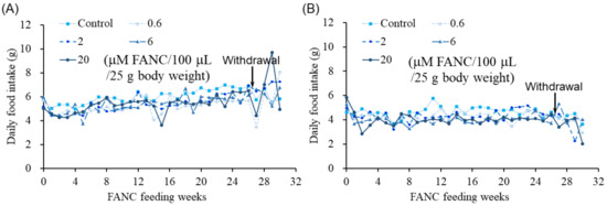 Daily food intake of ICR mice after daily feeding with FANCs for 6 months. Daily food intake of (A) male and (B) female mice. Food intake was calculated according to each mouse’s daily consumption. Data are expressed as mean ± SD.