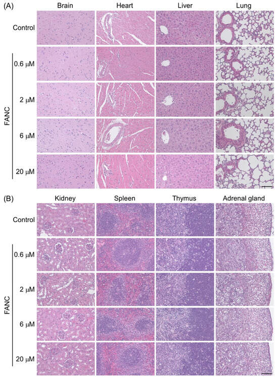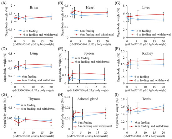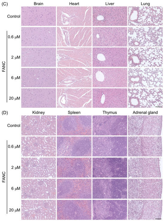 The organ weights (%) of the ICR mice after daily FANC administration for six months, followed by a four-week withdrawal period, are presented in Figure 3. The organ weights of the brain, heart, liver, lungs, spleen, kidneys, thymus, adrenal glands, testes, and ovaries were similar between male and female mice across all experimental groups, with no significant differences compared with their respective control group. These findings suggest that FANC administration at doses below 20 μM FANC/100 μL/25 g body weight did not induce noticeable changes in organ weights.