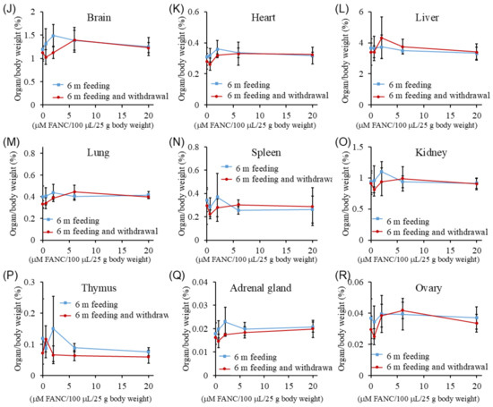Changes in organ weight (%) of ICR mice after daily feeding with FANCs for 6 months, followed by 4-week withdrawal. Organ weight (%) of (A–I) male and (J–R) female mice. Organ weight% = (organ weight/body weight) × 100. Data are expressed as mean ± SD (6 m feeding: n = 5; withdrawal: n = 3).