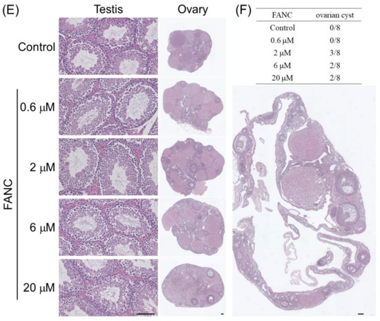 Representative H&E-stained histological sections of tissues from ICR mice after feeding with FANCs for 6 months. Sections of brain, heart, liver, lung, kidney, spleen, thymus, and adrenal gland from (A,B) male and (C,D) female mice. (E) Sections of testis from male and sections of ovary from female mice. (F) Incidence and representative image of an ovarian cyst from an FANC-treated group. Scale bar = 100 μm.
