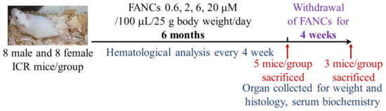 The chronic toxicity test followed the guidelines of the International Council for Harmonisation of Technical Requirements for Pharmaceuticals for Human Use (ICH). Forty male and forty female 7-week-old mice were randomly divided into five groups (n = 8): control (water), 0.6, 2, 6, and 20 μM FANC/100 μL/25 g body weight (equivalent to 0.16, 0.53, 1.57, and 5.26 μg FANC/kg). FANCs were administered orally via gavage daily for six months. Physiological and behavioral changes, toxicological signs, and mortality were observed daily, and food intake and body weight were measured weekly. Blood samples were collected every four weeks for hematological analysis. After six months, five mice per group were randomly selected and sacrificed for organ weight measurement, serum biochemistry, and histopathological analysis. Organ tissues were fixed in 10% neutral-buffered formaldehyde, embedded in paraffin, sectioned at 2 μm, and stained with hematoxylin–eosin for histopathological evaluation. The remaining three mice in each group underwent a four-week withdrawal period, after which they were sacrificed for toxic reaction recovery assessment (Figure 5).