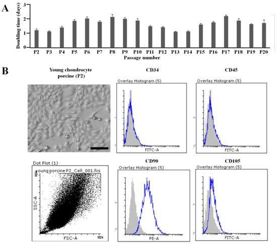 The biological characteristics of cells collected from one-day-old porcine cartilage tissue. (A) The cell proliferation rate, measured by the doubling time, ranged from 1 to 2 days and was observed from stage P1 to P20. (B) At passage 2 (P2), the cells expressed the following surface markers: CD34 (0.19 ± 0.18%); CD45 (0.28 ± 0.19%); CD90 (95.57 ± 0.48%); and CD105 (9.58 ± 1.48%) (scale bar: 100 µm).