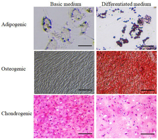 The differentiation potential of stem cells from one-day-old porcine cartilage tissue. Adipogenic differentiation: The ability to form adipocytes was observed using Oil Red O staining in a differentiation medium. Red-stained lipid droplets were observed after 14 days of culturing in the differentiation medium, compared to the negative control, where they were not observed (scale bar: 10 µm). Osteogenic differentiation: The ability to form osteocytes was observed using Alizarin Red staining in an osteogenic differentiation medium. The red staining of Alizarin Red confirmed differentiation into osteocytes observed after 21 days of culturing in the differentiation medium, compared to the negative control, where staining was not observed (scale bar: 50 µm). Chondrogenic differentiation: Thin sections of the 3D tissue samples showed staining with Safranin-O in both media (scale bar: 50 µm).