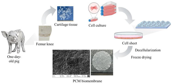 The biomembrane-forming capability of the stem cells from one-day-old porcine cartilage tissue. The cells derived from one-day-old porcine femur knee cartilage tissue formed the cell sheet. The PCM biomembrane, harvested after decellularization and freeze-drying processes, showed the fiber structure in the SEM image.