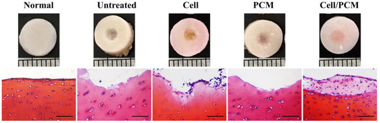 Cross images and Safranin-O staining showed the formation of new cartilage tissue in the defect area. No new tissue was observed in the defect area in the untreated group, and the damaged surface was uneven. This group served as a control group to understand the impact of not treating the defect. New tissue with a few cells appeared in the defect area in the cell-treated group, and the damaged surface was uneven. This result indicated the limitation of healing the defect if the treatment lacks cell stabilization at the injury site. In the PCM-treated group, no new tissue formed at the defect; however, the cartilage surface at the injury site was smooth, indicating the PCM treatment’s efficacy in limiting damage. The structural uniformity, with notable differences compared to the normal sample, suggests the impact of the PCM treatment. In the cell/PCM-treated group, the combination of cells and the PCM indicated a synergistic or combined treatment effect. New tissue formed in the defect area, with the cells resembling chondrocytes and the lacunae stained with Safranin-O (Figure 4).
