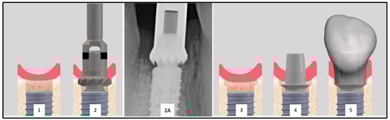 Inserted implant with clearly visible proximal bone overhangs (1). To allow the placement of the provisional restoration a bone profiler is used (2). Radiographic image of an exemplary Bone Profiler (2A). This tool reduces the bone of the supracrestal complex according to the diameter of the abutment (2). The conditioned bone is visible (3). The conditioning of the bone enables the seamless placement of the abutment (4) and the restoration (5).