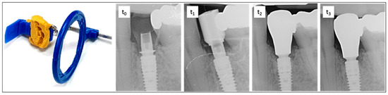 On the left is the radiographic film holder, which was customized with malleable silicone to ensure a reproducible position for all imaging sessions. On the right is an exemplary sequence of dental radiographs taken at time points t0, t1, t2, and t3. t0—time of implantation. The subcrestal position of the implant and bonding base is clearly visible. Adaptation using the Bone Profiler System enabled the insertion of the provisional restoration by removing obstructive proximal bony overhangs and shaping the emergence profile. t1—six months after implant placement with a scan body. t2—one-year follow-up showing bone remodeling and the final restoration. t3—two-year follow-up demonstrating stable bone conditions around the implant and completed remodeling.