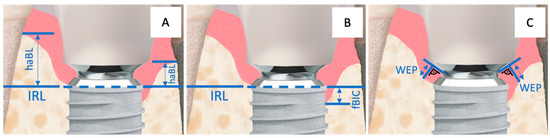 Implant–abutment junction with the corresponding measurement points: (A) = haBL, (B) = fBIC, and (C) = WEP. The horizontal, partially dashed line represents the Implant Reference Level (IRL).