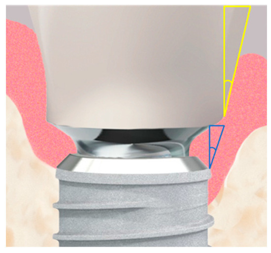 The implant–abutment junction is shown in high magnification. Two measured angles are illustrated: the actual emergence angle of the restoration is shown in yellow, while the fixed angle between the implant shoulder and the abutment, shown in blue, is 10°.