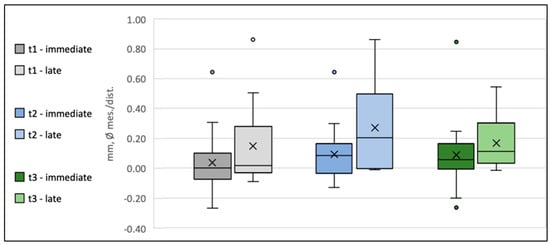 Box plot diagram of the development of the width of the emergence profile (Δ WEP) at time points t1, t2, and t3 for Group 1 (Type 1A) and Group 2 (Type 4A). The crosses indicate the mean values, the horizontal lines within the boxes represent the medians, whiskers denote the minimum and maximum measured values, and the circles indicate the respective outliers.