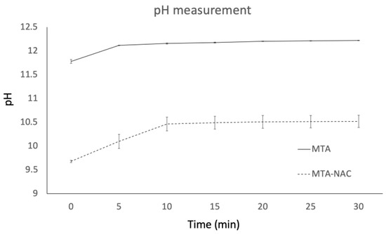 Time-dependent changes in pH of MTA and MTA-NAC solutions.