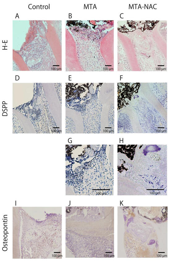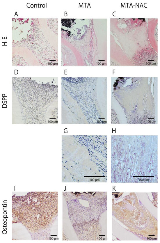 In the control group, H–E staining revealed a heightened inflammatory response just below the pulp cut surface and throughout the upper part of the root canal (Figure 2A). The MTA group exhibited a moderate inflammatory response localized beneath the pulp cut surface (Figure 2B), whereas the MTA–NAC group showed only mild inflammatory cell infiltration in the same area (Figure 2C). Immunohistochemical staining for DSPP revealed no DSPP-positive areas in the control and MTA groups (Figure 2D,E). In contrast, the MTA–NAC group showed mildly DSPP-positive areas just below the pulp cut surface (Figure 2F). Figure 2G,H show the magnified details of Figure 2E,F. Immunohistochemical staining for osteopontin indicated no osteopontin-positive areas in the control group (Figure 2I). However, the MTA group displayed osteopontin-positive areas beneath the pulp cut surface (Figure 2J), whereas the MTA–NAC groups showed these areas below the pulp cut surface and above the root canal (Figure 2K).