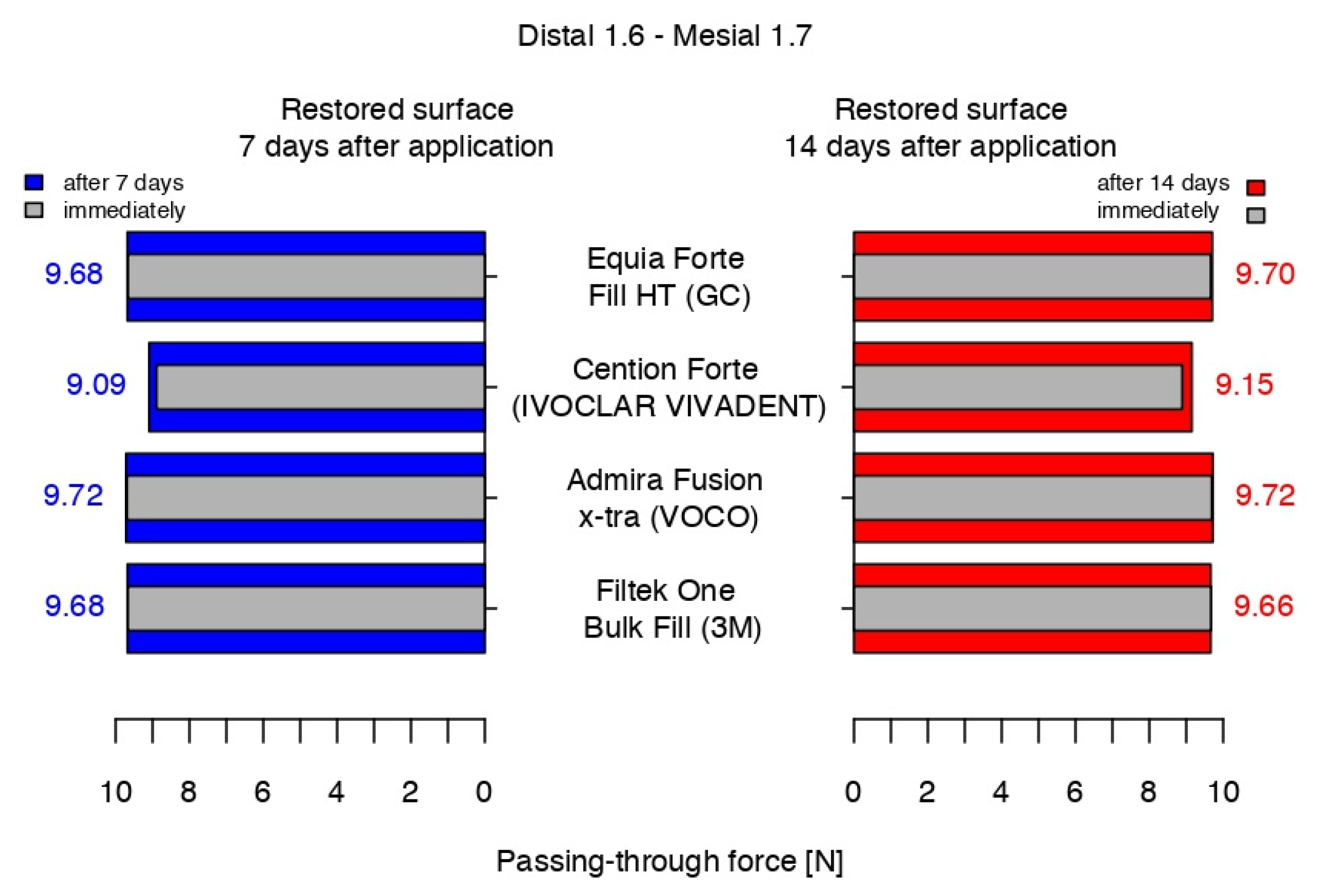 At the end of the working protocol, the passing-through force of all restored contact areas showed significantly higher values than those of the sound proximal surfaces, with all biomaterials presenting highly similar values, except for the Cention® Forte.