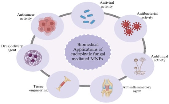 - Seetharaman, P.K.; Chandrasekaran, R.; Periakaruppan, R.; Gnanasekar, S.; Sivaperumal, S.; Abd-Elsalam, K.A.; Valis, M.; Kuca, K. Functional attributes of myco-synthesized silver nanoparticles from endophytic fungi: A new implication in biomedical applications. Biology 2021, 10, 473. [Google Scholar] [CrossRef]
