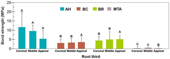 MTA sealer exhibited significantly lower bond strength values than the other two calcium silicate-based sealers, BC and BR. This finding is in line with previous studies reporting lower bond strength values of MTA than other sealers [5,10]. Inferior bonding efficiency of MTA could be due to reduced bioactivity, more specifically apatite formation, which was not only quantitatively lower but also delayed in MTA compared to another calcium silicate-based sealer [31]. Reduced apatite formation, especially in interfacial spaces, could not improve bonding efficiency or dislocation resistance, resulting in lower bond strength values compared to other sealers from the same group.