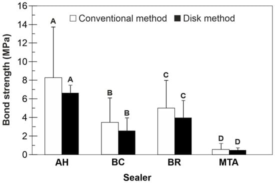 Figure 2 shows the bond strength values obtained using the disk method and their relation to the mean bond strength values for each sealer obtained using the conventional method. The disk method showed significantly the highest bond strength values for AH and the lowest for MTA (p < 0.05). BR and BC resulted in comparable values (p > 0.05) between AH and MTA. When comparing the two methods, no significant differences in bond strength values were found in any sealer group (p > 0.05), albeit the disk method resulted in more homogenous, i.e., less dispersed values than the conventional method.