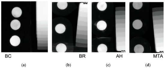 Digital x-rays of (a) BC sealer; (b) BR sealer; (c) AH sealer; (d) MTA sealer.