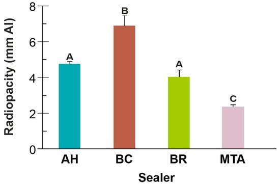 Radiopacity of BC and BR calcium silicate-based sealers determined in the present study was above the threshold of 3 mm Al required by the ISO standard [25]. BC sealer showed substantially higher radiopacity (7 mm Al), more than twice the standard threshold value, exceeding the AH control (4.5 mm Al). These findings are in line with those previously reported by Janini et al. (7.5 mm Al) [35]. Conversely, MTA Fillapex showed radiopacity below the required standard, which was in line with a recent study (2.7 mm Al) [36]. Differences in radiopacity are due to the type and amount of radiopacifying agent in sealer composition [22]. MTA contains calcium tungstate as a radiopacifier, while BR and BC have zirconium oxide. AH contains both of these radiopacifiers, which may contribute to higher radiopacity of this sealer [22]. However, manufacturers do not disclose the amount of radiopacifier in their sealer composition, making the comparison impossible. High radiopacity was also reported for TotalFill BC in another study (6.1 mm Al) [14], albeit there are also some contradictory reports [22,23,24,36,37], which could be due to different measurement techniques. BR demonstrated a radiopacity around 5 mm Al, which is in line with results reported by Siboni et al. (5.2 mm), while Prüllage et al. reported somewhat higher values (6.85 mm Al) [20,21]. High radiopacity is not necessarily desirable, as it may mask internal sealer porosity.