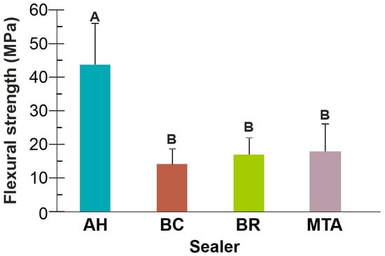 Flexural strength (mean ± SD) of the tested sealers. Columns sharing the same uppercase letter are not significantly different (p > 0.05).