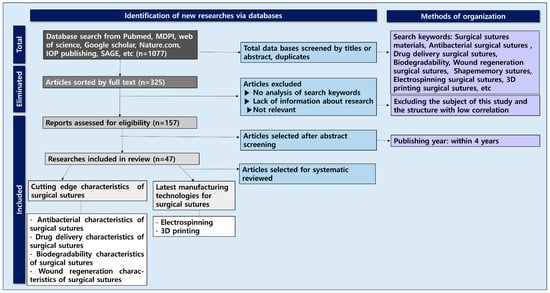 In addition, the latest technologies for manufacturing surgical sutures were divided into electrospinning and 3D printing. In conclusion, this study aimed to provide a systematic review of the cornerstone applications of cutting-edge surgical suture material design.